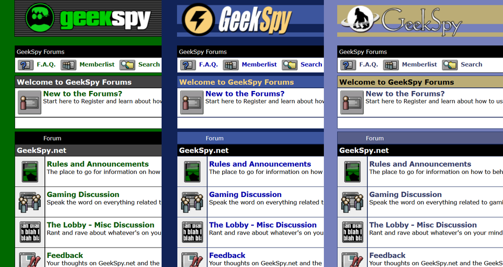 The GeekSpy Forums launched in 2012 with three retro looks - all faithful recreations of the GameSpy, 3D Action Planet, and Planet Black & White ForumPlanet skins.
